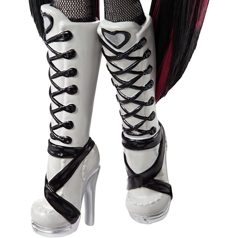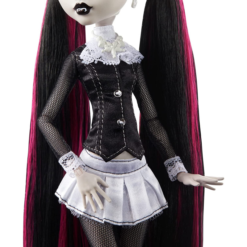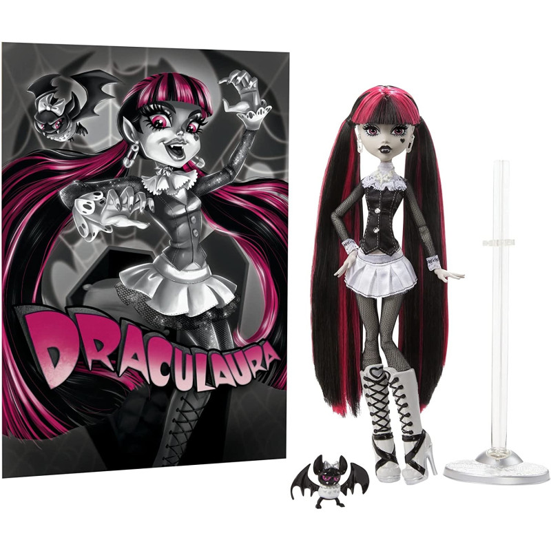 Boneca Monster High Draculaura Morcego Colecionador. Este vampiro é assustador-chique em um colete preto e saia plissada com botas de plataforma com cadarço. Com seu fiel ajudante de morcegos, Conde Fabuloso ao seu lado, ela está pronta para todos os tipos de emoções! Draculaura mostra um pôster de filme Uhhhmazing projetado no estilo de thrillers preto e branco vintage. Apresentando obras de arte originais, este pôster vem em tamanho de boneca. Para os fãs de Monster High que adoram um bom filme de terror, a coleção Reel Drama combina design contemporâneo impressionante com detalhes nostálgicos