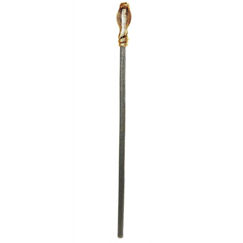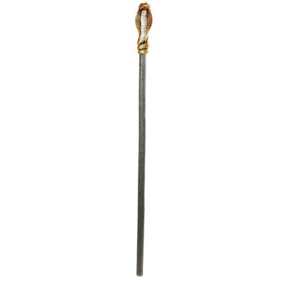 Inclui um cajado com detalhe de cobra ao redor na cor dourada e material de plástico.