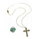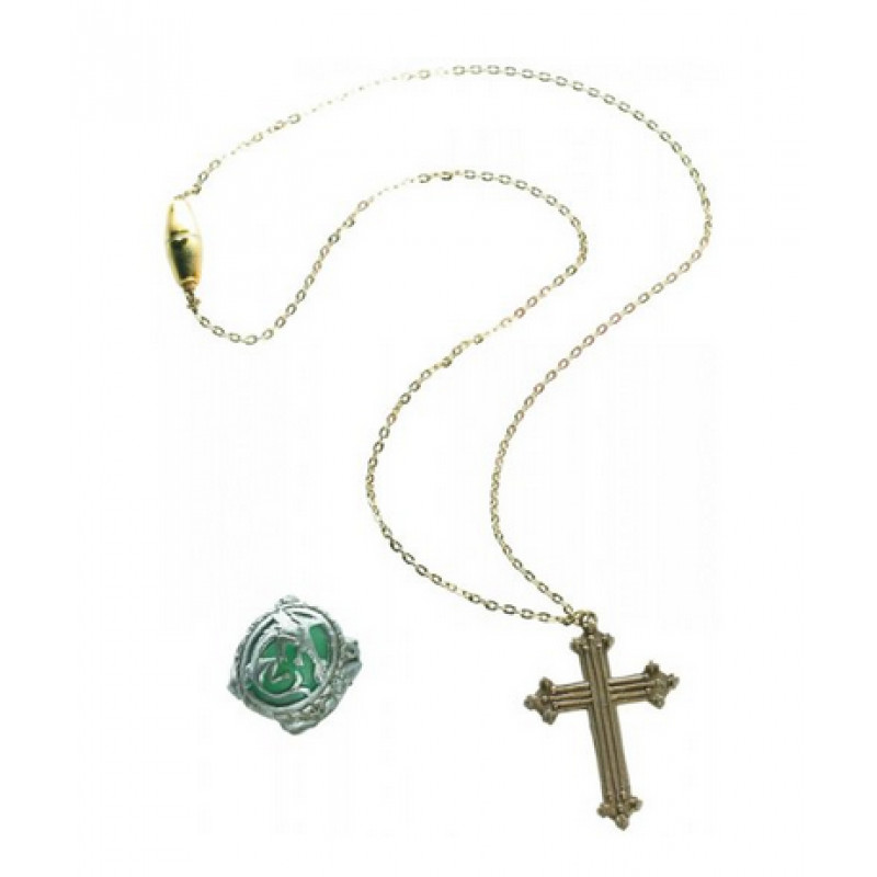 Colar com crucifixo e anel da Angelica. Inclui colar imitando o colar da personagem em dourado com crucifixo e anel em prateado e pedra na cor verde azulado.