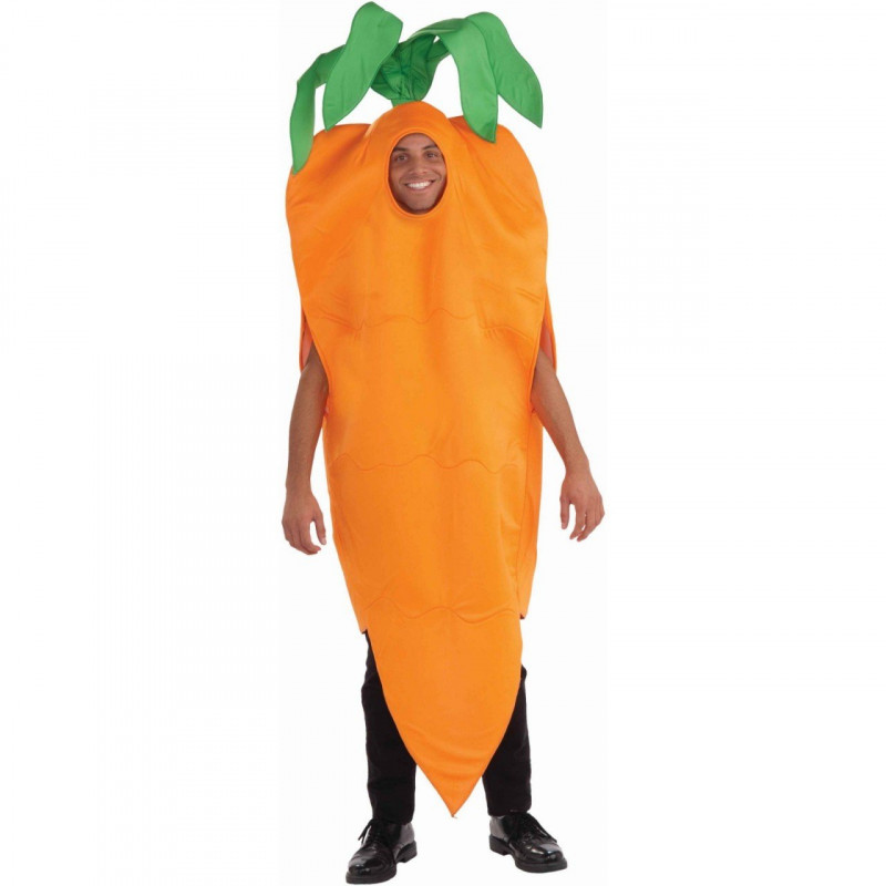 Este traje é fiel à forma de cenoura, possui um corpo real laranja de tecido leve e macio, desde a cabeça até o tornozelo. Este traje inclui uma túnica laranja com um cabo verde ao topo, em anexo.