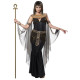 O traje adulto Cleópatra inclui um vestido preto com detalhes de tecido brilhante no busto e nos quadris, uma capa destacável, um colar de jóias e um cinto com brilho combinando.