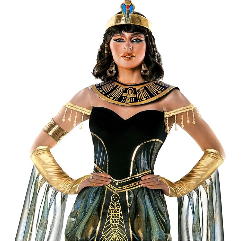 O traje adulto Cleópatra inclui um vestido preto com detalhes em dourado, ajustado no busto e nos quadris, com detalhe de sobre-saia na cintura. Braceletes, um colar de jóias e um cinto com brilho combinando. Enfeite da cabeça dourado, tornam esse traje ainda mais realístico.