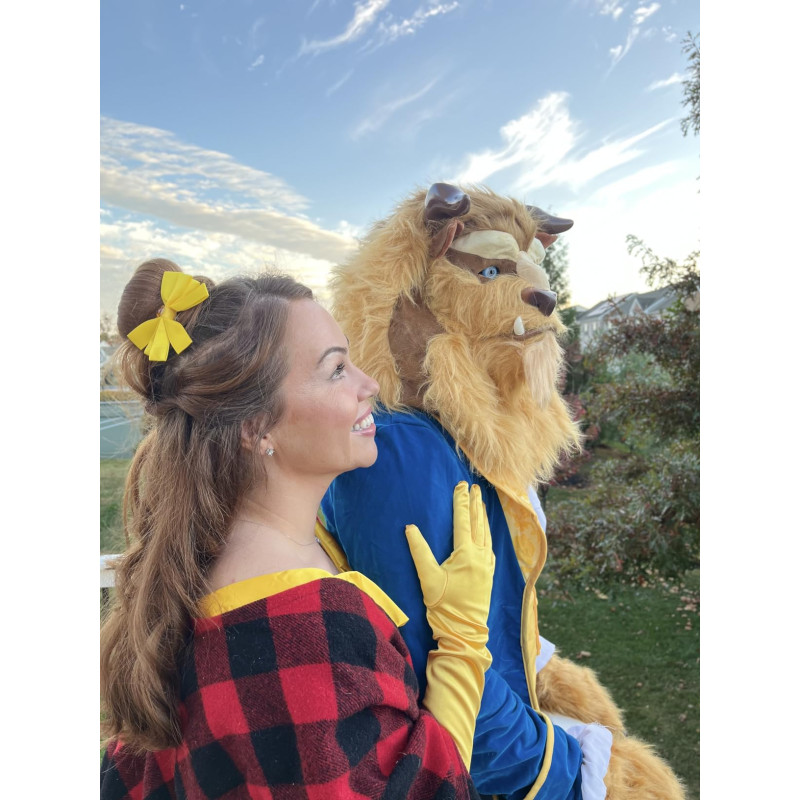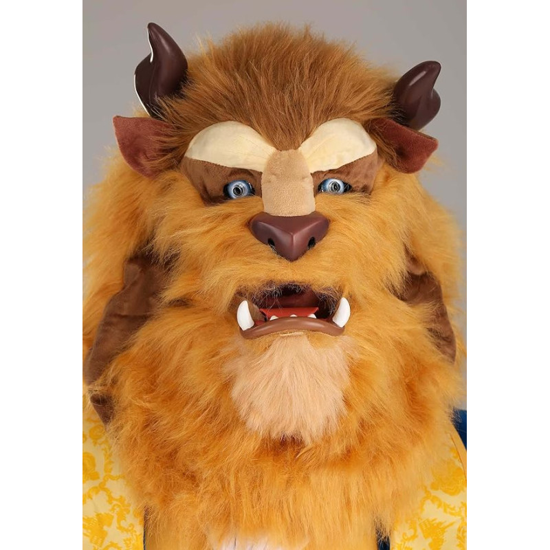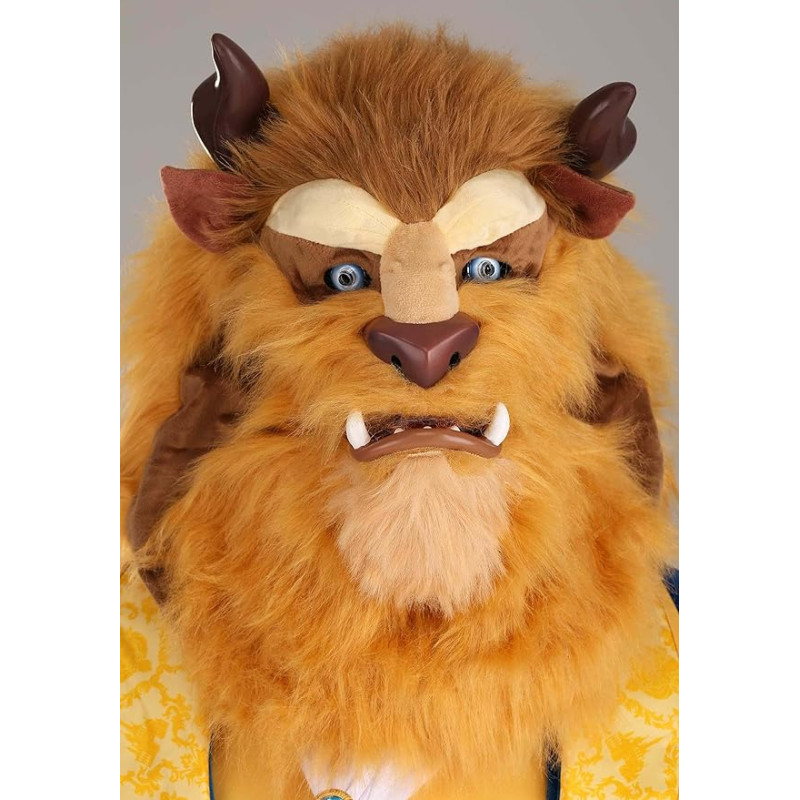 Fantasia Adulto Fera da Bela e a Fera Disney Luxo Clássica Autentico. Este traje adulto inclui um casaco real em tons vermelho e dourado. Com punhos com acabamento refinado em dourado, colete azul estampado também faz parte do traje, e gravata branca. Inclui também uma máscara peluda e monstruosa do personagem com movimento da boca, dando um charme extra a fantasia.