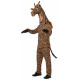 Este traje inclui uma blusa com mangas compridas e estampa de girafa, calças seguindo o mesmo estilo. Cabeça com longo pescoço, com o rosto do animal bem no alto e luvas pretas completam o traje.