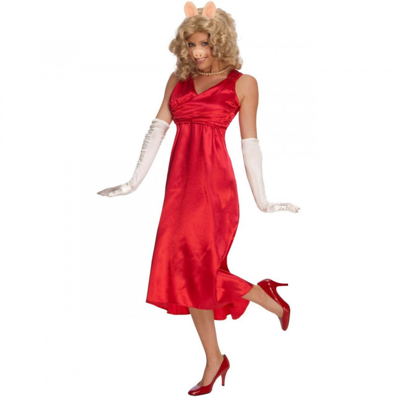 Você estará fantasticamente espetacular neste vestido muito chique, em vermelho paixão da Miss Piggy. Também estão incluídas as luvas brancas, um colar de pérolas lindo, peruca com orelhas e nariz.