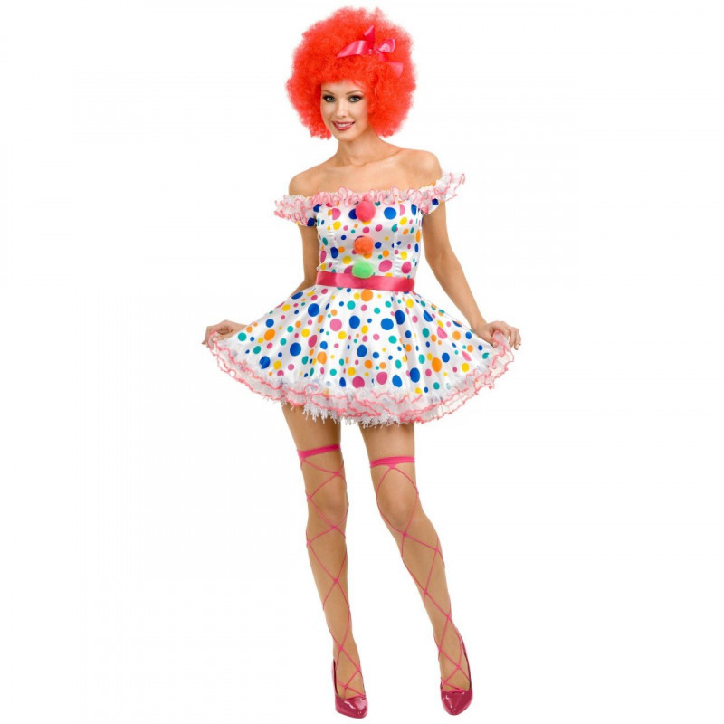 Você vai ser a atração da festa com este traje de adulto de palhaço que inclui um vestido multi colorido. Com babado na gola e na barra. Cinto e enfeite de pompons na frente.