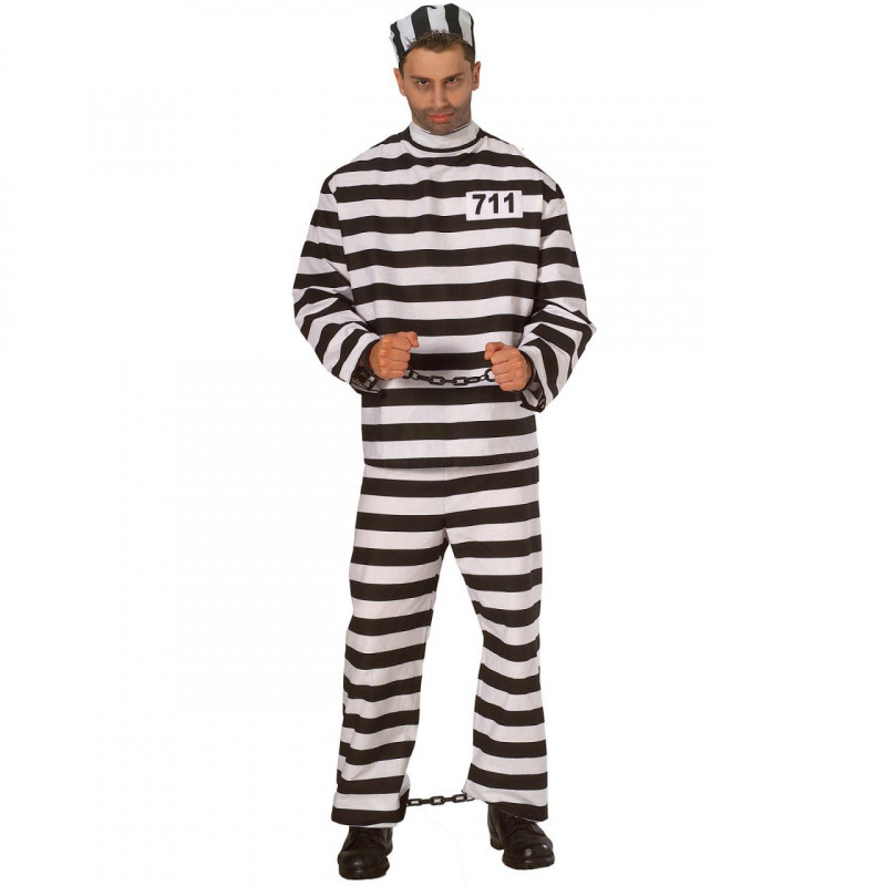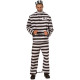 Este traje de prisioneiro inclui uma blusa de listas preto e branco, calças combinando e boné.