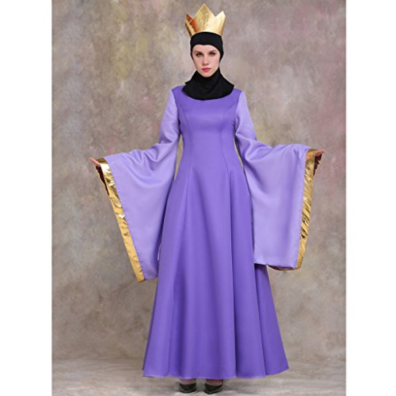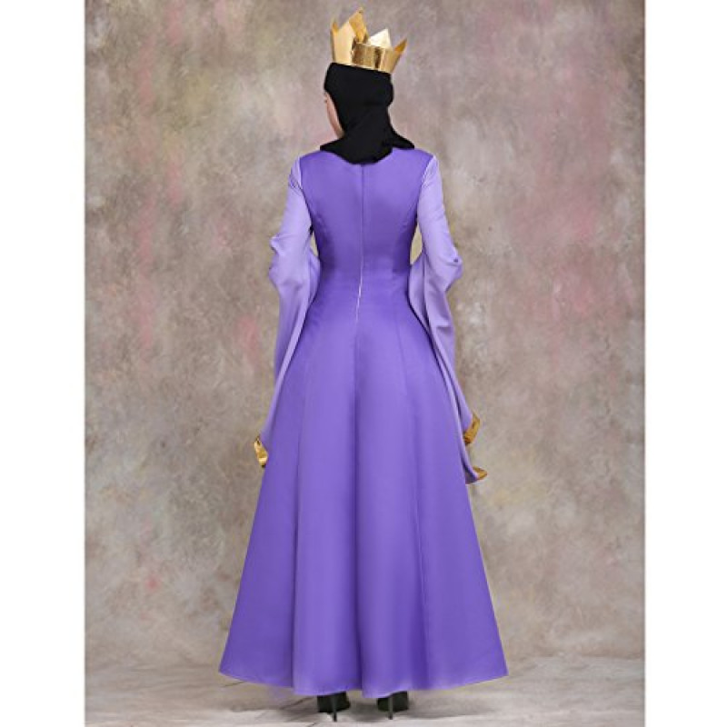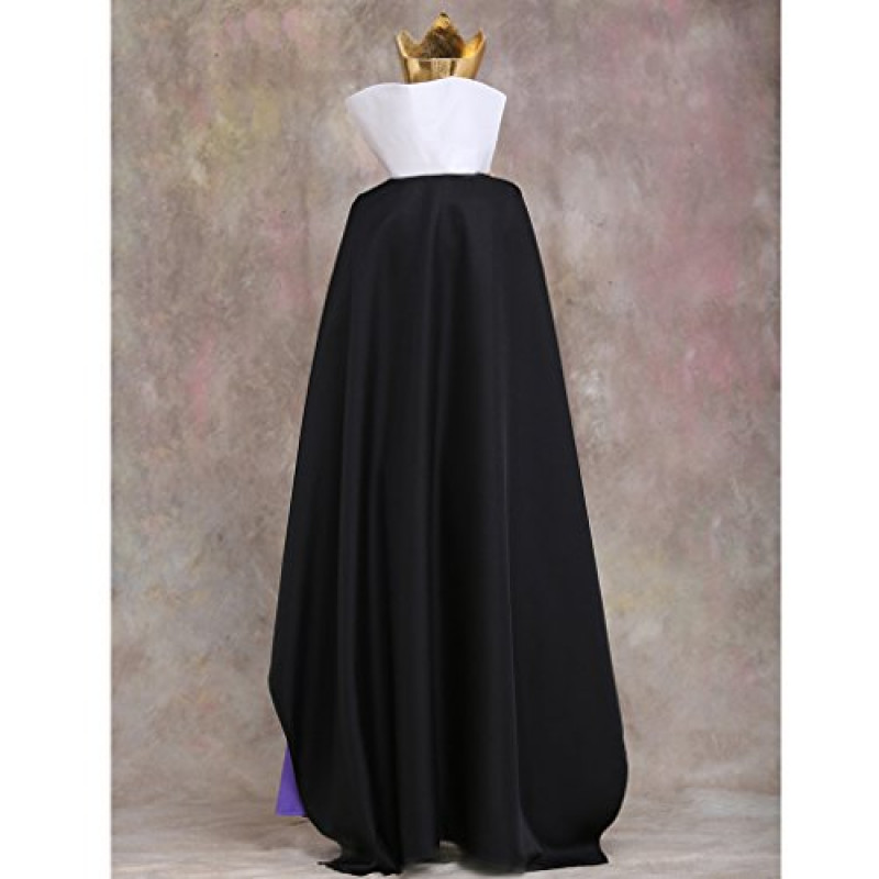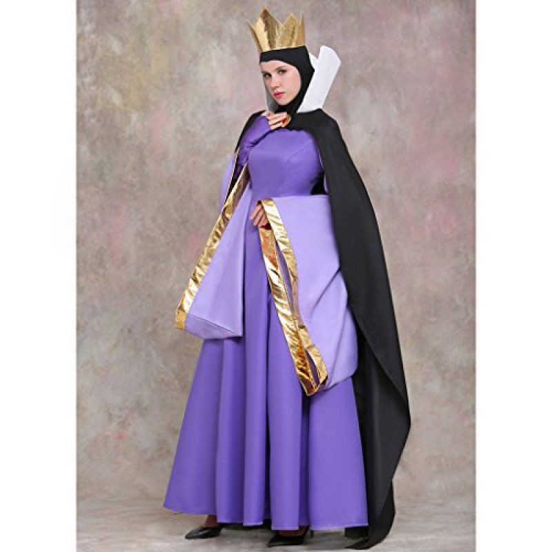 O traje da Rainha Má inclui um vestido longo lilás e dourado nas mangas. Capa preta longa com gola alta, inclui também enfeite da cabeça que completa o personagem.