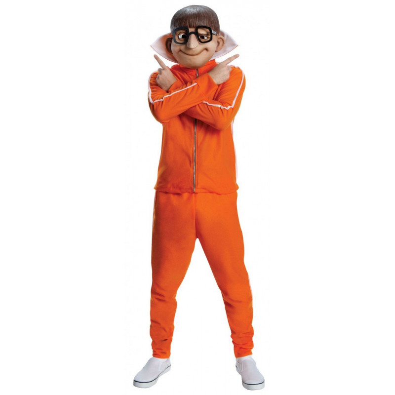 Este traje inclui uma jaqueta laranja com listras brancas e uma gola alta, calça laranja combinando. Inclui também uma máscara do personagem, de plástico rígido.