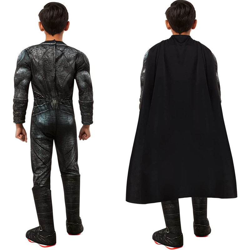 Fantasia infantil do super herói Black Adam inclui um macacão todo desenhado na cor preta. imitação de botas , cinto e uma linda capa completam o traje.