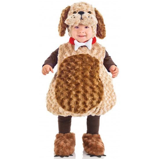 Macacão em cor marrom claro com detalhes em marrom escuro, um traje alegre e divertido. Simplismente um charme. Inclui um macacão sem mangas com detalhe na gola em vermelho e com uma touca com as orelhas, nariz e o rostinho do cachorrinho. Inclui também uma capa imitando os pés.
