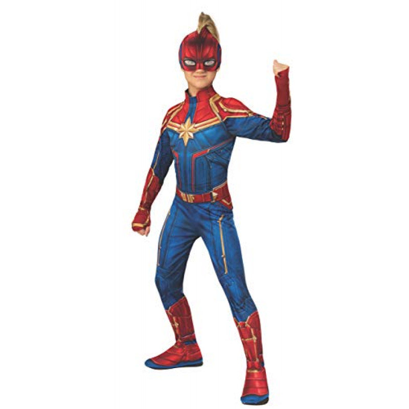 Linda fantasia da corajosa Capitã Marvel, das telinhas do cinema, Inclui um lindo macacão azul e vermelho, com imitação de botas e uma linda máscara da personagem, para esconder sua identidade.