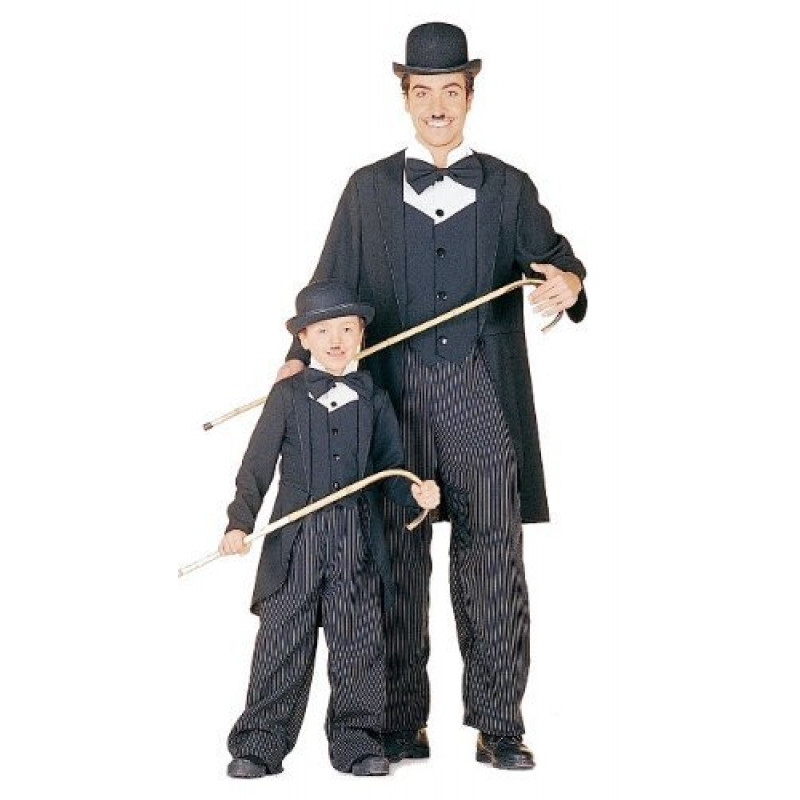 Charlie Chaplin traje infantil inclui um casaco preto com camisa branca, uma gravata preta borboleta, calça cinza, chapéu estilo Chaplin e bigode do personagem. Fazendo com que se torne realmente esse ator tão amado e querido por todos nós.