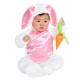 O traje infantil inclui um macacão macio de Micro Fibra branca com um torso de cetin rosa com feixo de pressão para fácil troca de fraldas. Um capuz de orelhas e botas removível também incluídas para completar este conjunto fofo.