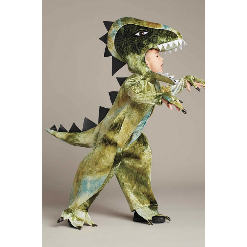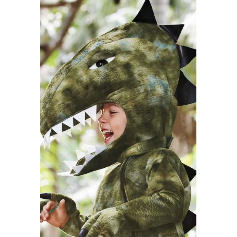 Fantasia na cor verde, com macacão modelado macio com cauda longa com barbatana, com detalhes imitando os pés e as mãos do animal. Composto também de uma touca com o rosto do personagem, com olhos, boca, dentes assustadores.