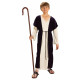 Este traje inclui um manto de cor clara, uma túnica de manga curta de cor escura aveludada, e um cinto estilo corda.