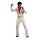 Com esta fantasia linda, contém um macacão branco, em tecido grosso e de qualidade, com gola alta, estilo e marca registrada do cantor, e decote baixo. Com desenhos de pedras na gola e em toda a frente, costas e na manga, com a barra da calça de sino forrada em vermelho, e um cinto todo cheio de detalhes em dourado e vermelho, e um cachecol vermelho para o pescoço dando o toque final ao traje.