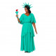 Este traje inclui vestido na cor verde, coroa de pontas, livro, e imitação de tocha.