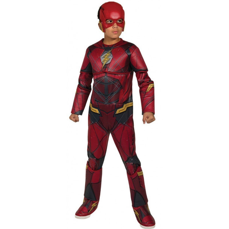 O traje Flash inclui um macacão na cor vermelho e logotipo do The Flash na frente do peito, com desenho do cinto em amarelo e imitação de botas amarela combinando, acompanha também uma máscara na cor vermelha.