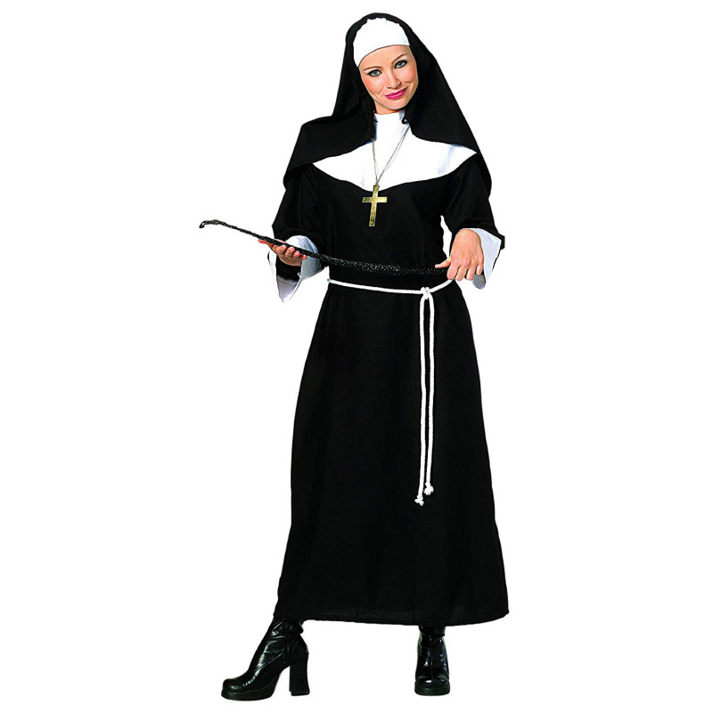 Seja uma pessoa com propósito cristão, vestida como uma autêntica freira nesta fantasia que inclui um vestido longo preto, um capuz sobre a cabeça branco, um véu sobre a cabeça em cor preta e um colar.