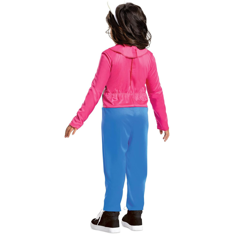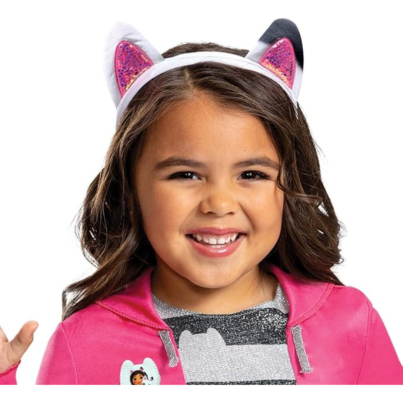 Este traje inclui macacão com capuz falso, suéter frontal com camafeu da Gabby, frente com listras metálicas cinza, tiara de gatinho para completar o traje.