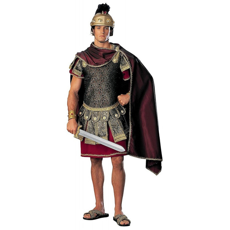 Composto de uma túnica vinho com detalhes em metal dourado em toda barra, armadura toda bordada com detalhes de dourado em toda parte. Capa combinando com detalhes na borda também toda bordada. Este é um traje que vai fazer você entrar para a história Romana.