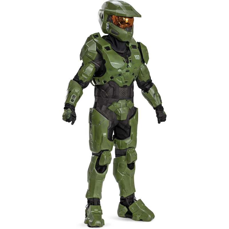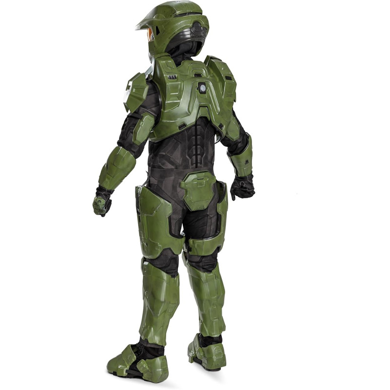 Este traje inclui um macacão de poliéster de excelente qualidade com capuz, luvas combinando, capacete com luzes LED, armadura do peito, armadura para os braços, par de manoplas, peças de armadura para a coxa esquerda, peças de armadura para a coxa direita, par de caneleiras, capas para os sapatos da frente, capas para os sapatos de trás, peça para as nádegas, tudo na cor verde escura, tudo para completar este conjunto realístico do Halo.