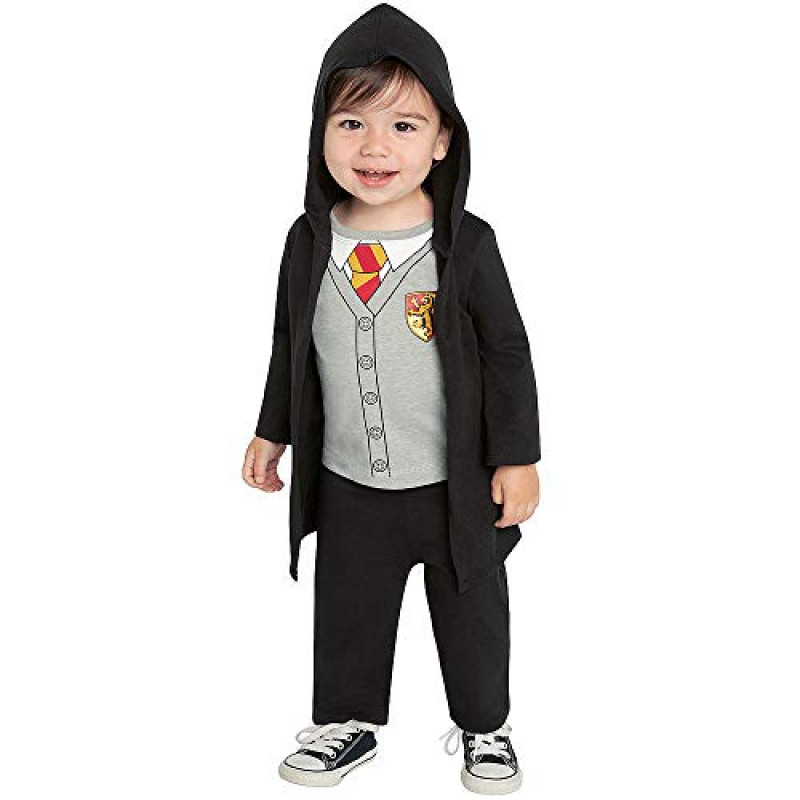 O traje infantil inclui um macacão macio com desenhos do logo da escola Harry Potter, gravata, camisa. E contém um casaco e capuz com o logo atrás Harry Potter.Perfeito e confortável, para seu pequeno final no estilo da casa e se divertir. Um óculos de tecido completa o traje.