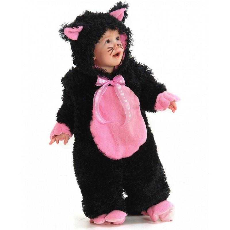Este traje inclui um macacão de mangas, com rabo, em tecido pelúcia preto com detalhes em rosa na manga, pernas e peito. Touca combinando com orelhinhas. Um laço rosa no pescoço dá o toque final a este traje.