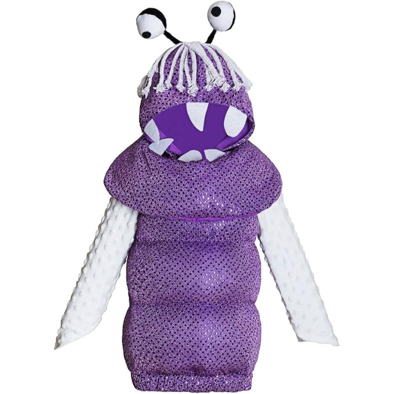 Fantasia inclui um macacão lilás todo cheio de detalhes, blusa com luvas e uma touca com olhos, cabelo e uma abertura para o rosto, tudo na cor lilás.