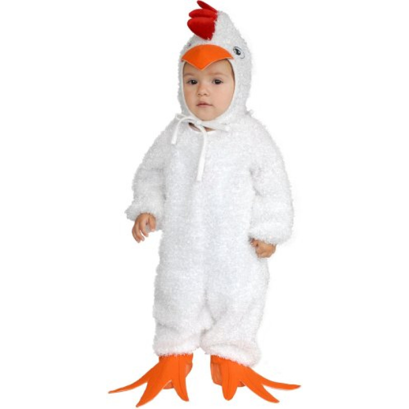 Uma galinha mais que encantadora. Inclui um macacão branco de tecido macio de pelúcia, confortável para as crianças, imitação de pés em laranja e uma touca com a carinha da galinha e bico, completando o traje.