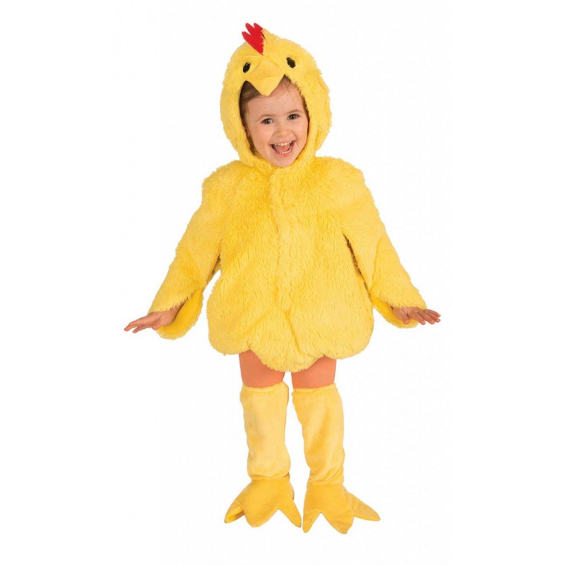 Um pintinho mais que encantador. Inclui um macacão amarelo de tecido macio de pelúcia, confortável para as crianças, imitação de pés estilo meia comprida e uma touca com a carinha da galinha e bico, completando o traje.