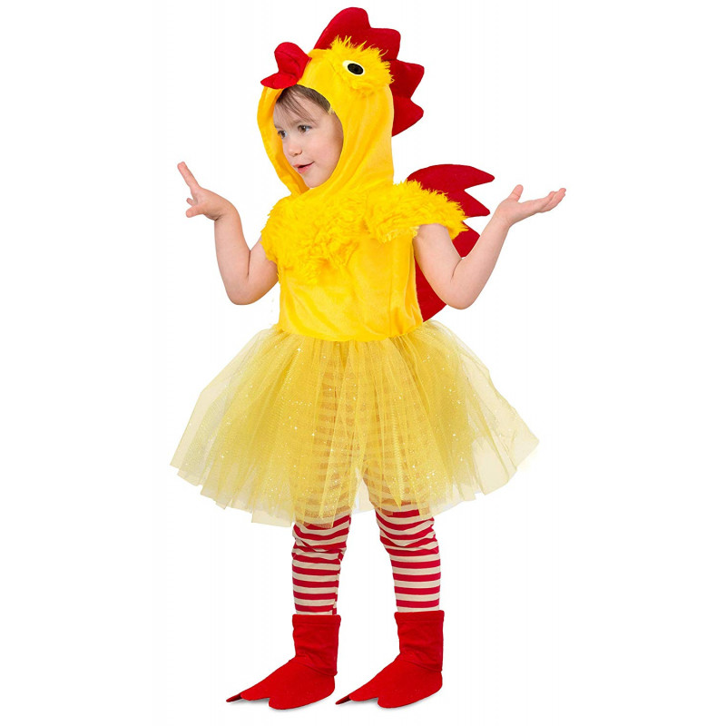 Um pintinho mais que encantador. Inclui um macacão amarelinho, meia calça listrada, confortável para as crianças, imitação de pés e uma touca com a carinha da galinha e bico, completando o traje.