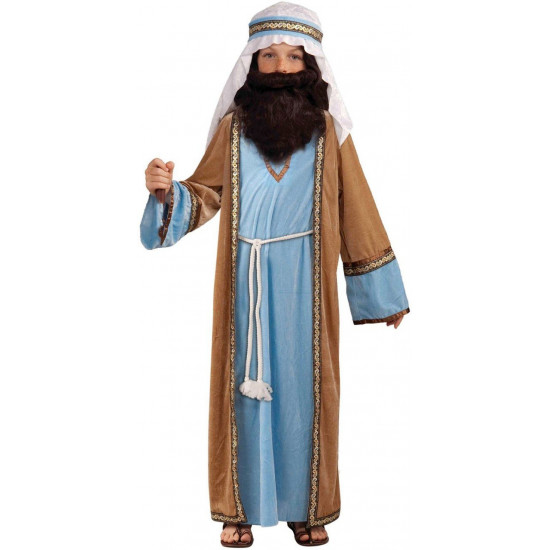 O traje de José inclui manto azul e túnica marrom com detalhes em azul e dourado. Detalhe da cabeça combinando e cinto de corda.