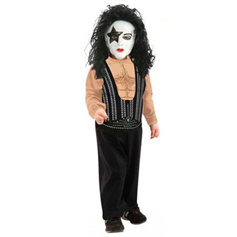 Os amantes do Rock and Roll e de seu ídolo das antigas, a banda KISS. Este traje do Kiss Starchild Paul Stanley, composta de um macacão na cor preta com detalhes prateados em toda parte. Composta de 83% poliéster, 17% spandex, tem decote em V profundo e vem com braceletes combinando.