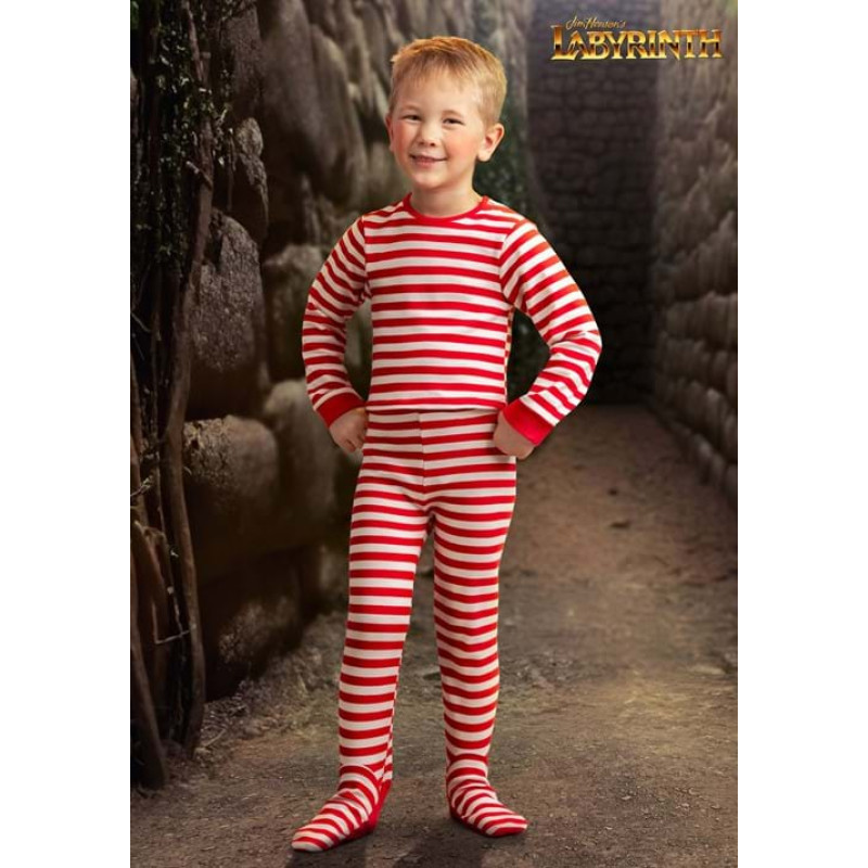 Este traje infantil do Toby Labirinto, inclui um macacão real em tons vermelho, listrado, dando um charme extra à fantasia.