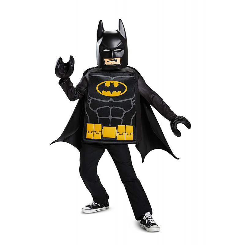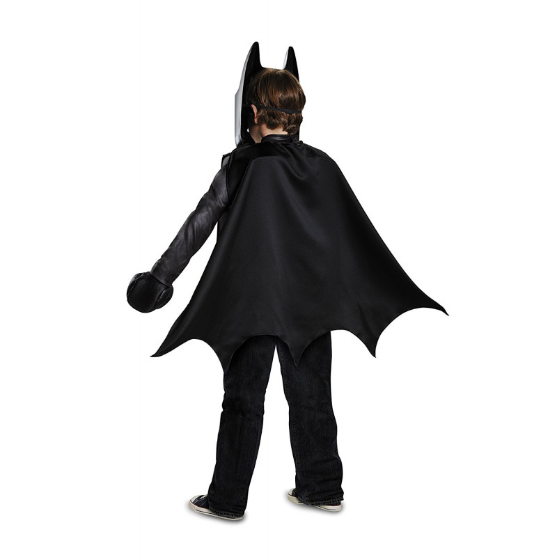 Seja como Batman no filme. Inclui uma blusa na cor preta com detalhes realísticos do boneco LEGO do filme, dando a impressão de ser um boneco de plástico, máscara do personagem, capa destacável e completando o traje inclui também luvas imitando a mão do boneco da lego.