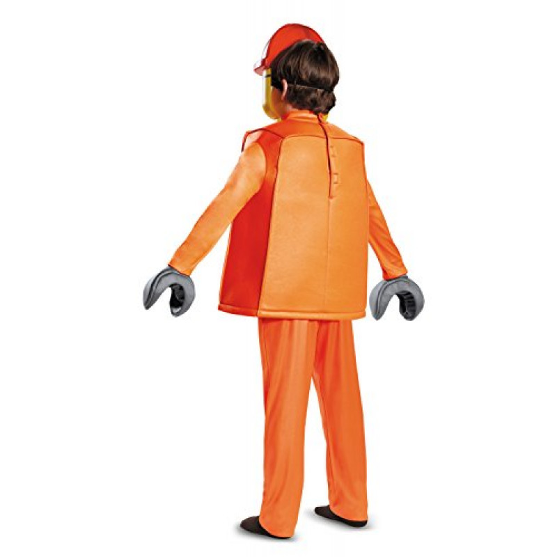 Inclui uma roupa na cor laranja com detalhes realísticos, dando a impressão de ser um boneco de plástico, máscara do personagem, calça em estilo e completando o traje. inclui também luvas imitando a mão do boneco da lego.
