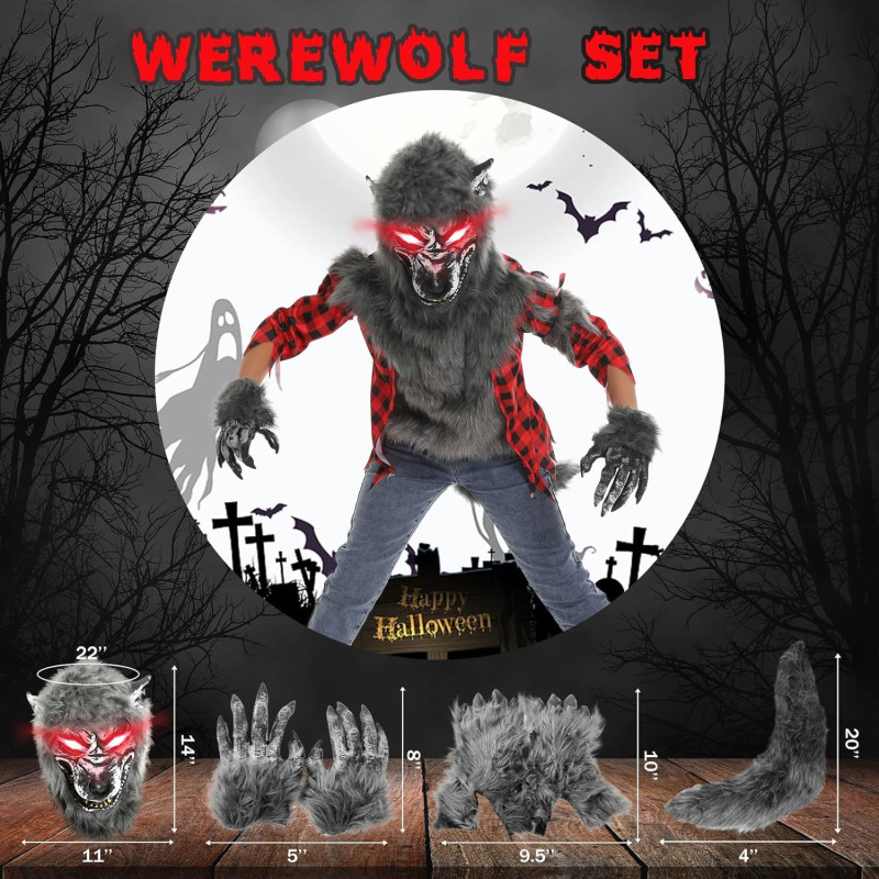 Fantasia Lobo Lobisomem Infantil Luxo. Parte homem, parte animal, este lobisomem inclui uma máscara de lobo assustador realística, camiseta, contendo uma camisa xadrez listrada com barra esfarrapada, peito peludo em anexo, mãos e pés dando um toque especial ao traje.