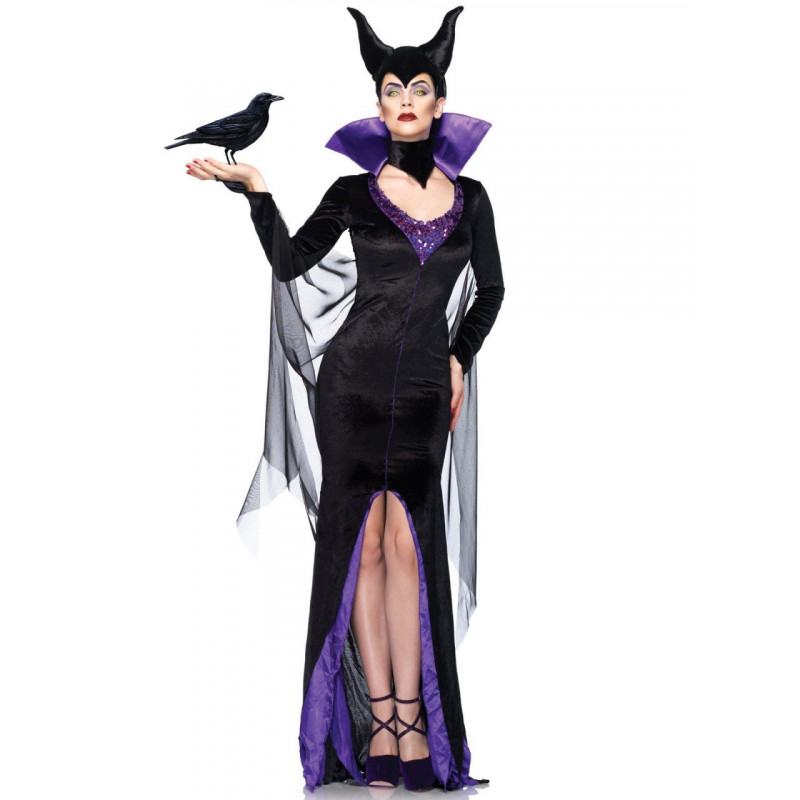 Este traje bruxa Malévola da Bela Adormecida inclui um vestido único, ajustado nas cores lilás, preto e rosa. Vestido com detalhes na barra e detalhes brilhantes na gola, dando um charme especial e requintado. Mangas longas combinando com o vestido. Gargantilha com gola alta com detalhe do broche na ponta. E chapéu também estilo da personagem e capa em tecido preto transparente.