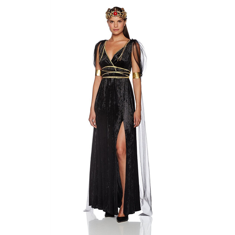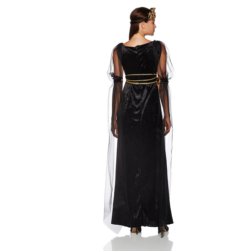 Este traje contém um vestido preto com detalhes dourado, mangas de tecido transparente, detalhe dos braceletes e detalhe da cabeça.