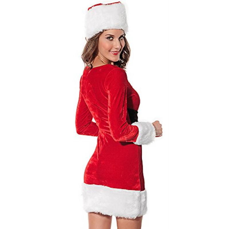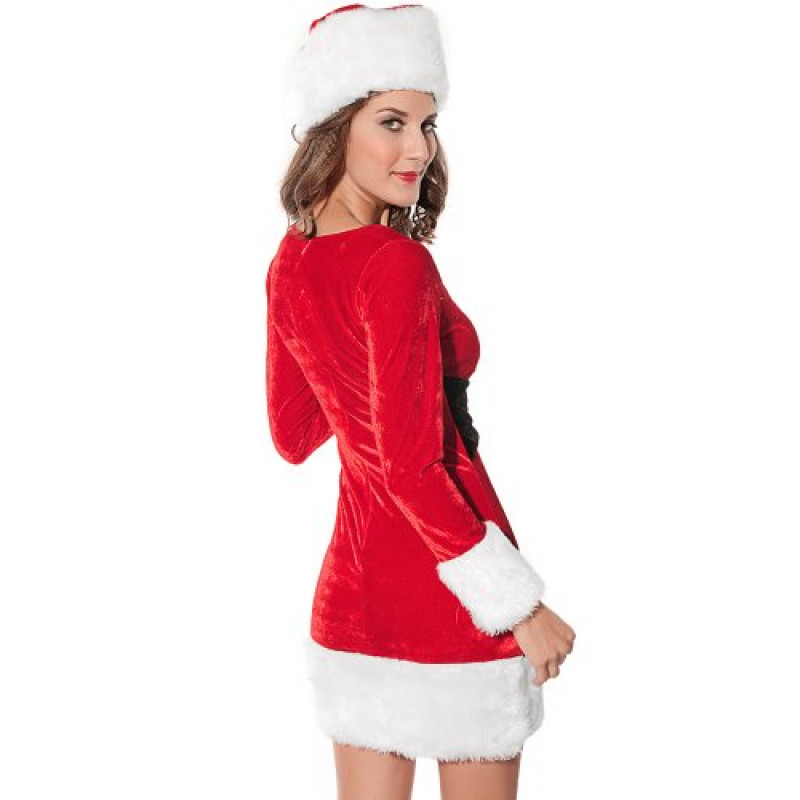 Este lindo e delicado traje consiste em um vestido com mangas. O traje inteiro tem detalhe de plush branco na borda da saia e manga. Um chapéu de papai Noel também faz parte desta fantasia, dando um toque final.
