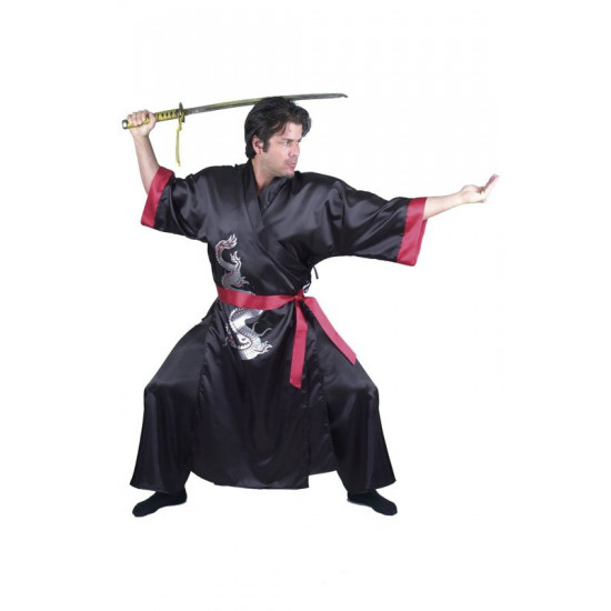 O traje Samurai inclui um roupão de cetim em preto, com acabamento em vermelho e detalhes de um dragão prata na parte lateral. Coordenado com calças e um cinto de amarrar combinando, para completar este traje único.