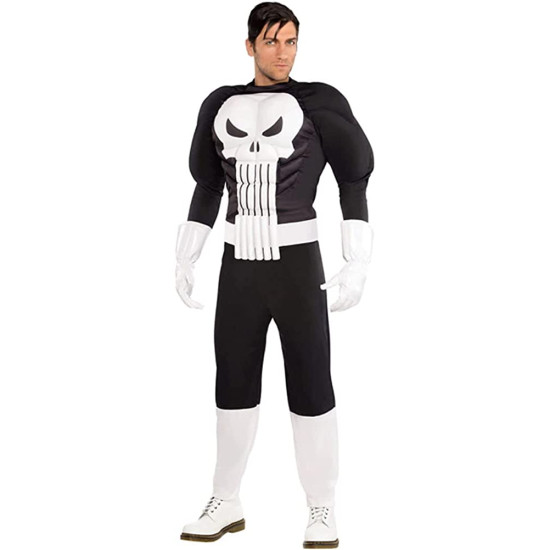 Fantasia composta de um macacão preto com uma caveira branca no peito, cinto e luvas para completar o traje.