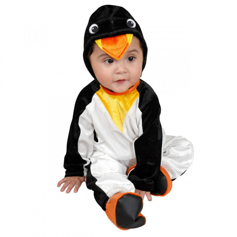 O traje infantil de Pinguim inclui um macacão branco e preto de tecido macio com detalhe amarelo na gola, um par de pés de pinguin laranja para os pezinhos e capuz preto com os olhos e um bico laranja.