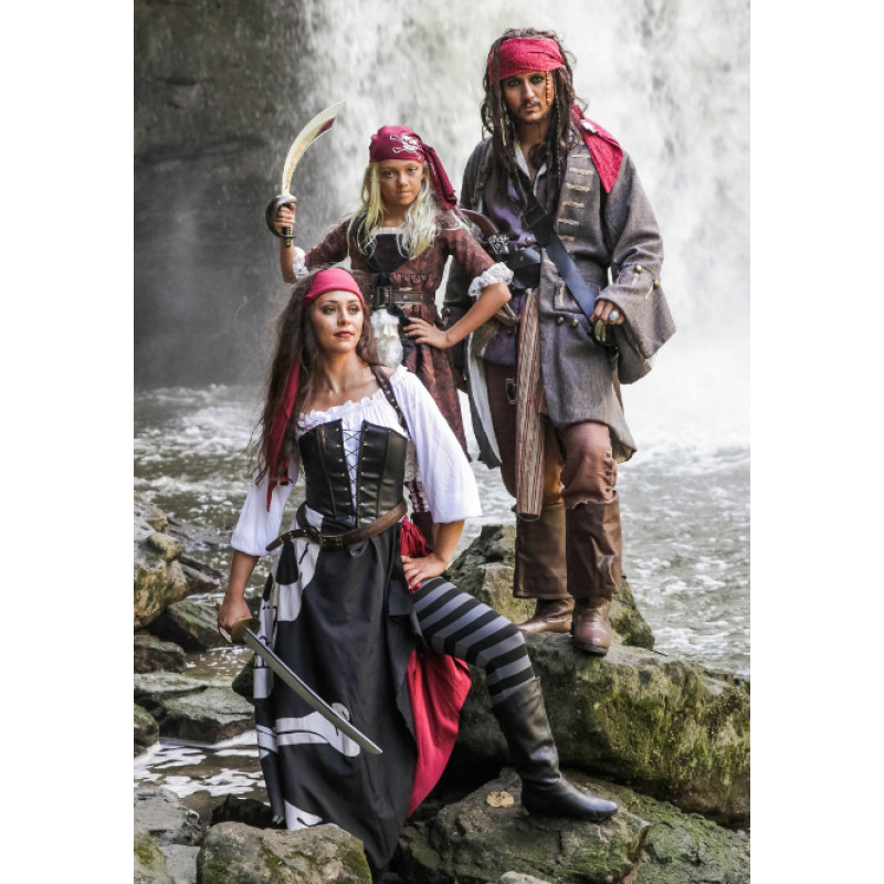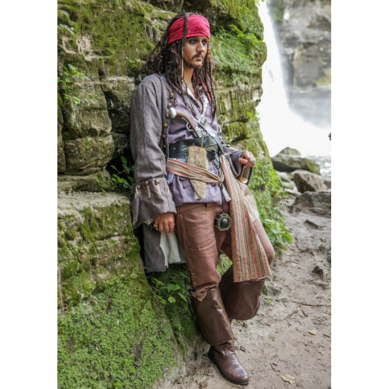 Camisa de manga comprida com botão até o punho. Veste roxa com botões de prata decorativos. Calça marrom curta com botão na cintura e têm bolsos frontais. 2 cintos pretos envolvem a cintura e 1 tem um suporte de espada anexado. Faixa colorida com laços de listras verticais em torno da cintura. Casaco marrom com detalhes azuis e é usado aberto, com botões falsos e punhos de grandes dimensões.