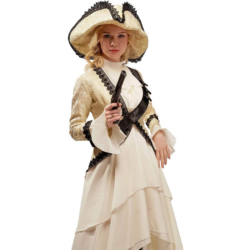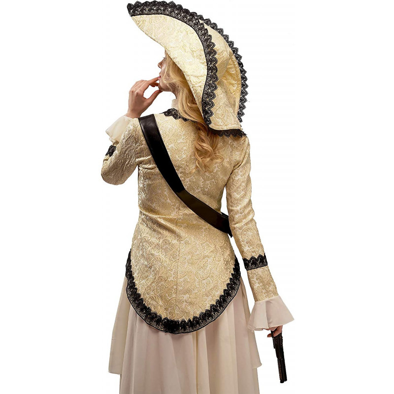 Inclui um vestido com saias longas e em camadas bege liso, um colete todo trabalhado cheio de detalhes em dourado, cinto transversal e um chapéu combinando.