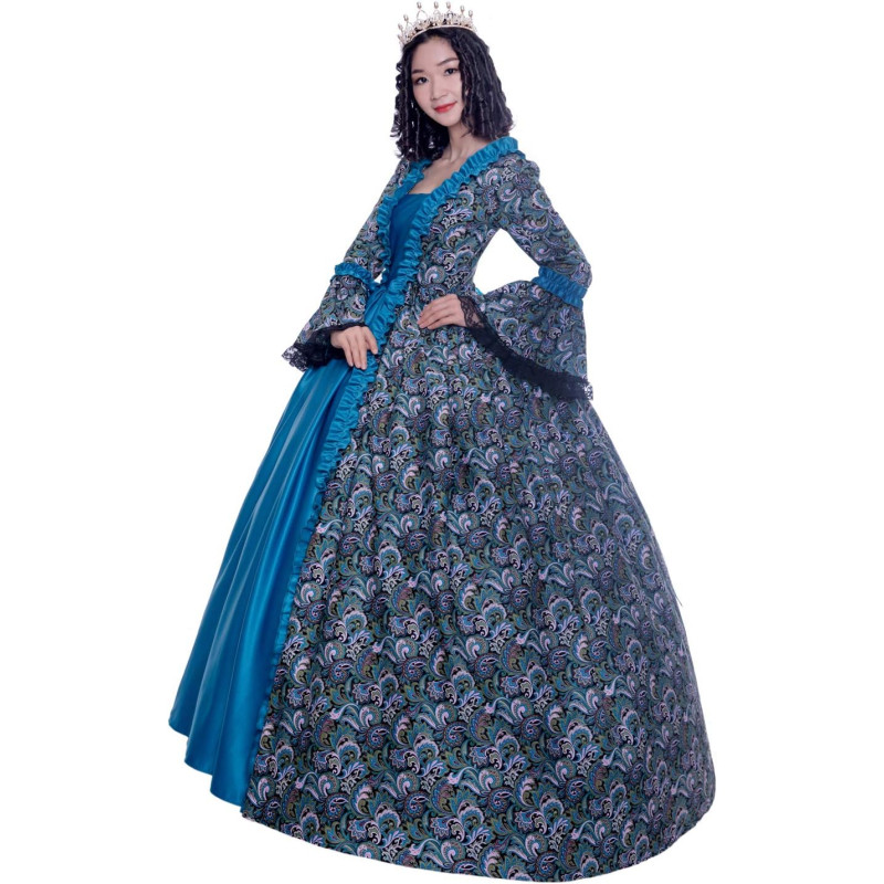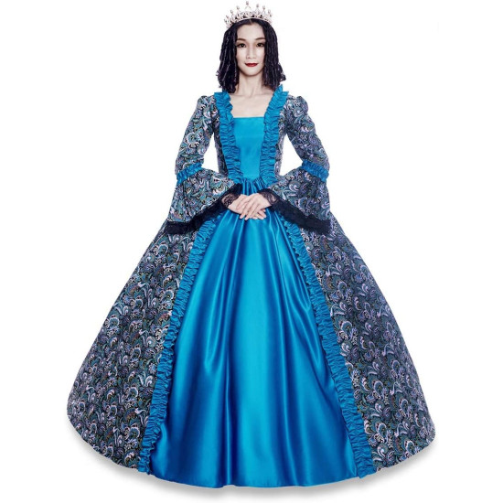 Este traje inclui um vestido longo, em cor azul e estampado, com detalhes de babados e mangas largas. Prfeito para completar o traje de rainha.