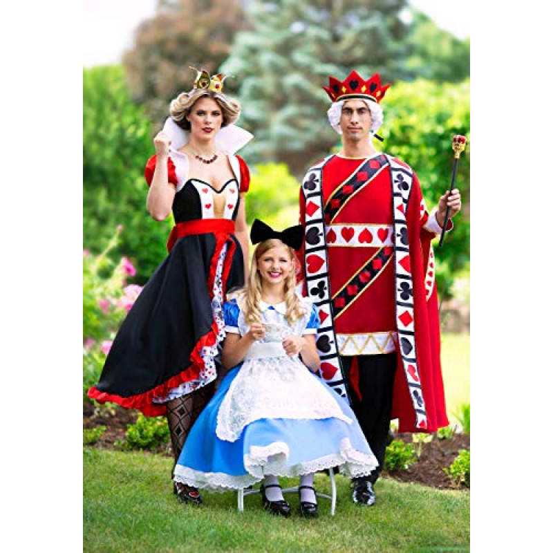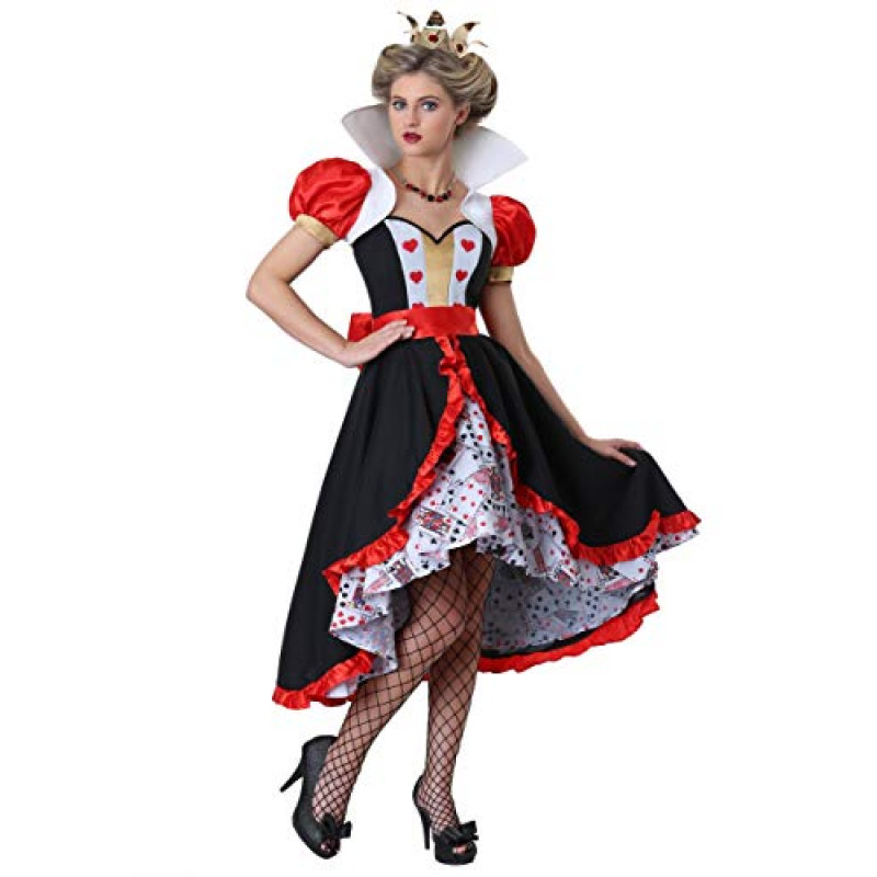 Este traje inclui um vestido com estilo, em preto, vermelho e dourado, com detalhes de fitas vermelhas nele todo. Saia com estampa de cartas e corações e sobre saia preta com detalhe de babado em toda a borda. Cinto e um lindo bolero de gola alta e mangas vermelhas bufantes com barra dourada, completam este traje.