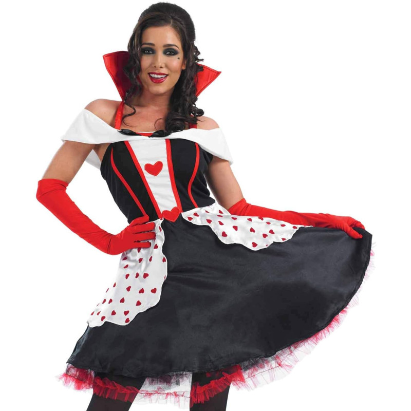 Este traje inclui um vestido com estilo, em preto e dourado. Corações enfeitando toda a sobre saia, que é a característica da personagem. Gola alta, dá um charme ao modelo, um par de meias pretas e um par de luvas vermelhas com completam o traje da Rainha de copas.